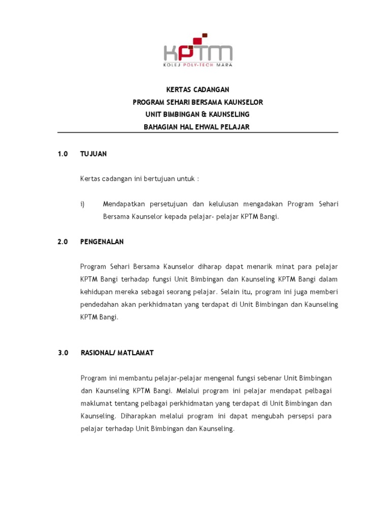 . Uncategorised Jabatan Perhutanan Anjung Malaysia Results. KERTAS CADANGAN PROGRAM SEHARI BERSAMA KAUNSELOR UNIT BIMBINGAN KAUNSELING BAHAGIAN HAL EHWAL PELAJAR 1. TEMPAT81 Kolej Komuniti Tawau Sabah9.